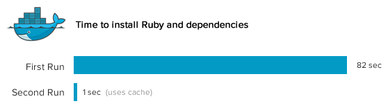 Wow - how did installing Ruby take under one second this time around? See those cache keys (ex: dc92be6158b0)? Rather than re-running the line from the Dockerfile, Docker sees that it has already run that command and just retrieves the file system changes from its cache. It can do this magic because Docker uses the AuFS file system, which is a union file system (kind of like applying diffs).