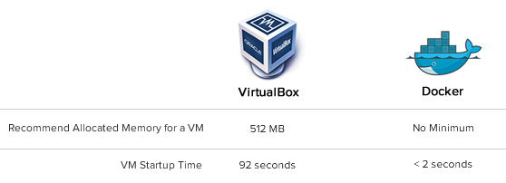 Our production environment has 16 servers. If I attempted to simulate this locally with VirtualBox's recommended configuration of 512 MB per-instance, this would use about twice the RAM I have on my laptop. VirtualBox has a lot of overhead as each image uses its own kernel and file system. This isn't the case with Docker - containers share the same operating system as the host, and when possible, the same binaries and libraries. It's possible to run hundreds of containers on a single Docker host.